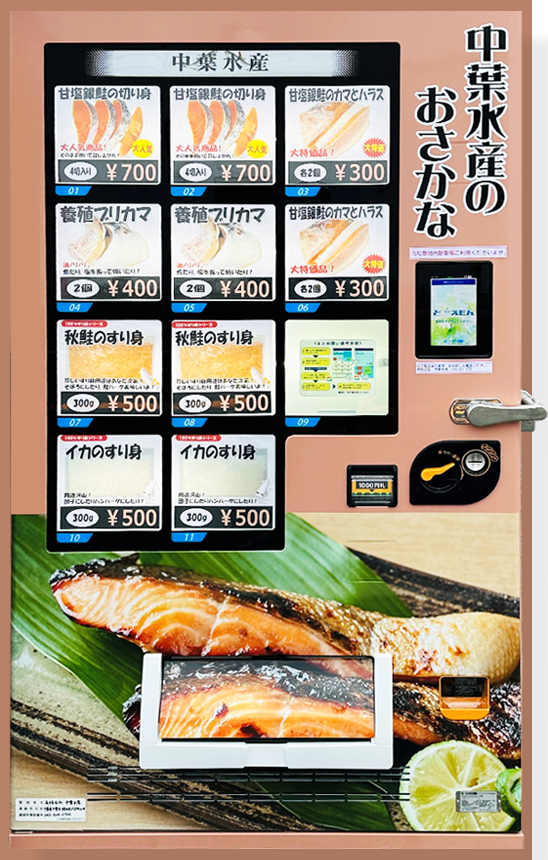 皆様によりお気軽に美味しい食材をお食べ頂けるよう、当社の前に自動販売機を設置
